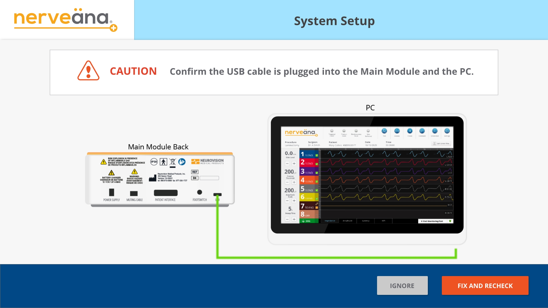 Added real-time feedback loops within the setup diagrams so clinicians can verify signal integrity and electrode connection status at a glance before moving to the next step.